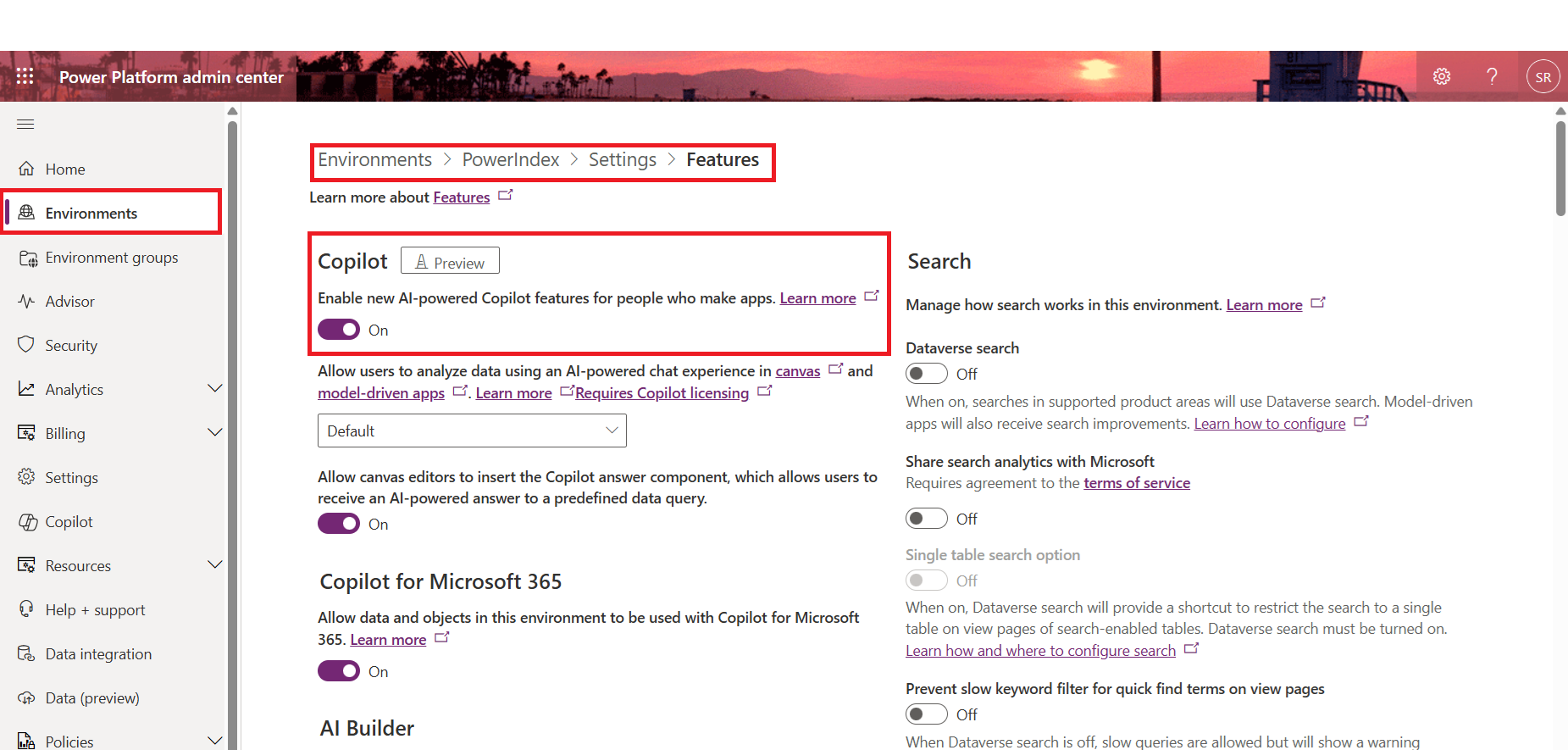 Enable Copilot features: Settings → Features → Enable Copilot Preview Feature for your environment.