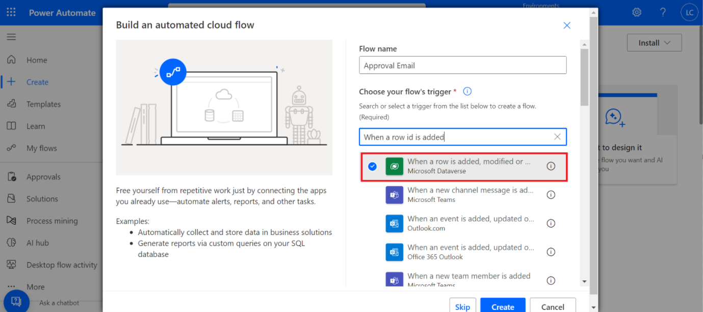 If it is 'Yes,' we can update this in Microsoft Dataverse. Add an action called 'Update a row,' and choose the correct table names and row IDs, such as 'accounts or contacts.' We can update the status reason value as approved.