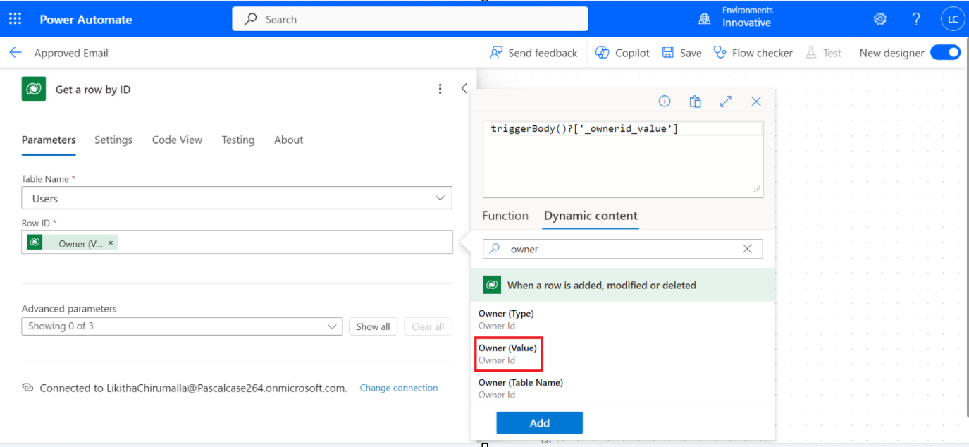 Use actions like 'Get a row by ID' to retrieve the owner information from Dataverse.