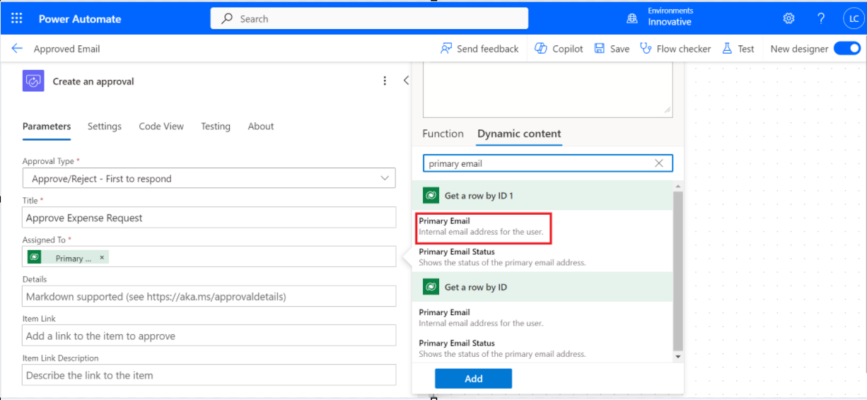 To create an approval action, add an Approval type as 'Approve/Reject – First to respond,' Title as 'Approve Expense Request,' and assign it to the primary email of the manager (access it from dynamic content).
