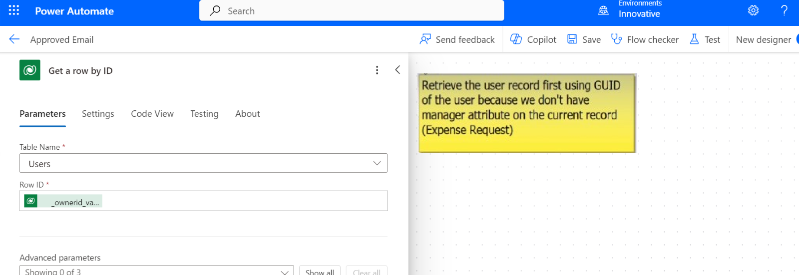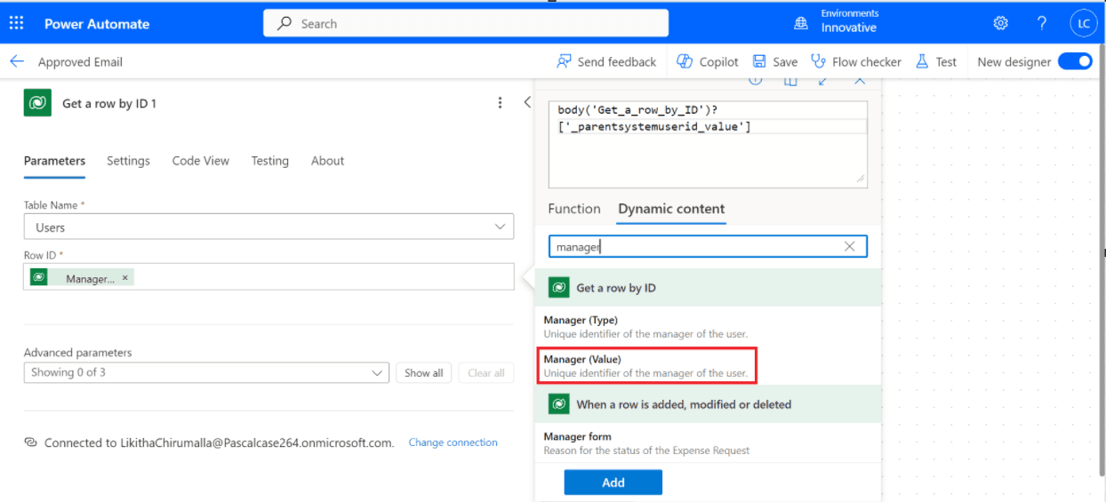 We must use the 'Get a Row by ID' action to obtain the Manager ID.