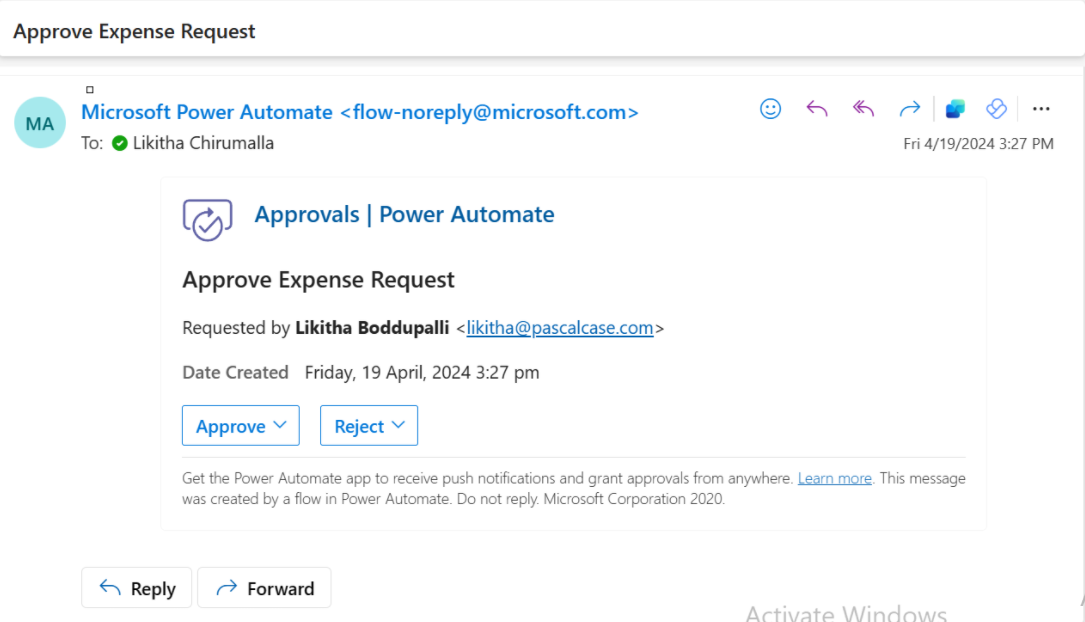 Execute a test to validate the functionality and then enact the trigger action based on the outcome of the approval process. Below is an image illustrating the process of receiving an email regarding an Approved Expense Request sent to the manager.