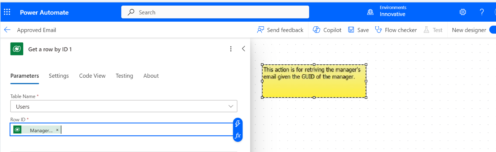 Add another action, 'Get a row by ID,' to retrieve the necessary information as the manager email from your data source. Set the table name as 'users' and the row ID as the Manager ID.